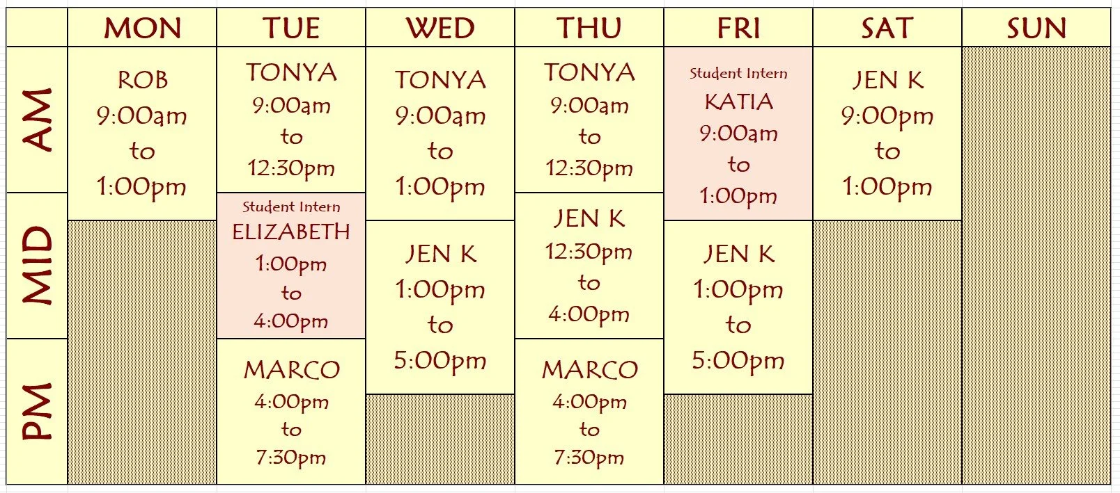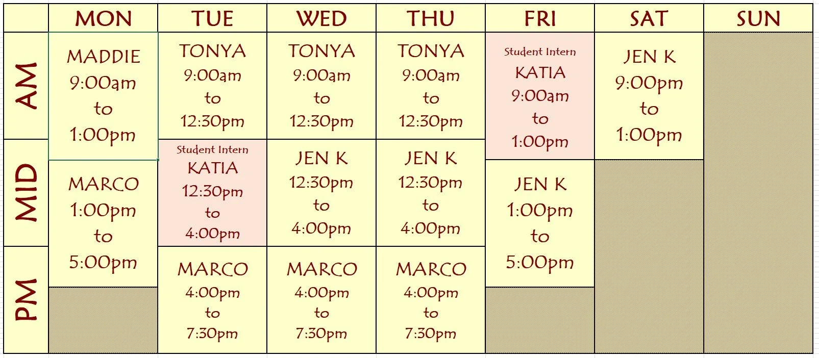 *Appointment availability will vary. If there is a special time that you would like to have each week, we can reserve that spot for you. Let us know if you have specific scheduling needs so we can find something that works for you.
